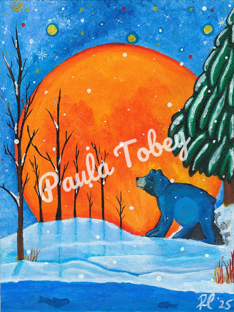 Under the watchful gaze of Makwa- giizis, the Bear Moon, a bear, its fur tinged with the blue of the winter sky, journeys through a snow-covered landscape. Bare trees reach towards the heavens, while a snow-laden evergreen stands as a symbol of enduring life. The large orange moon casts a warm glow upon the scene, evoking a sense of wonder, tranquility, and the magic of winter nights.
