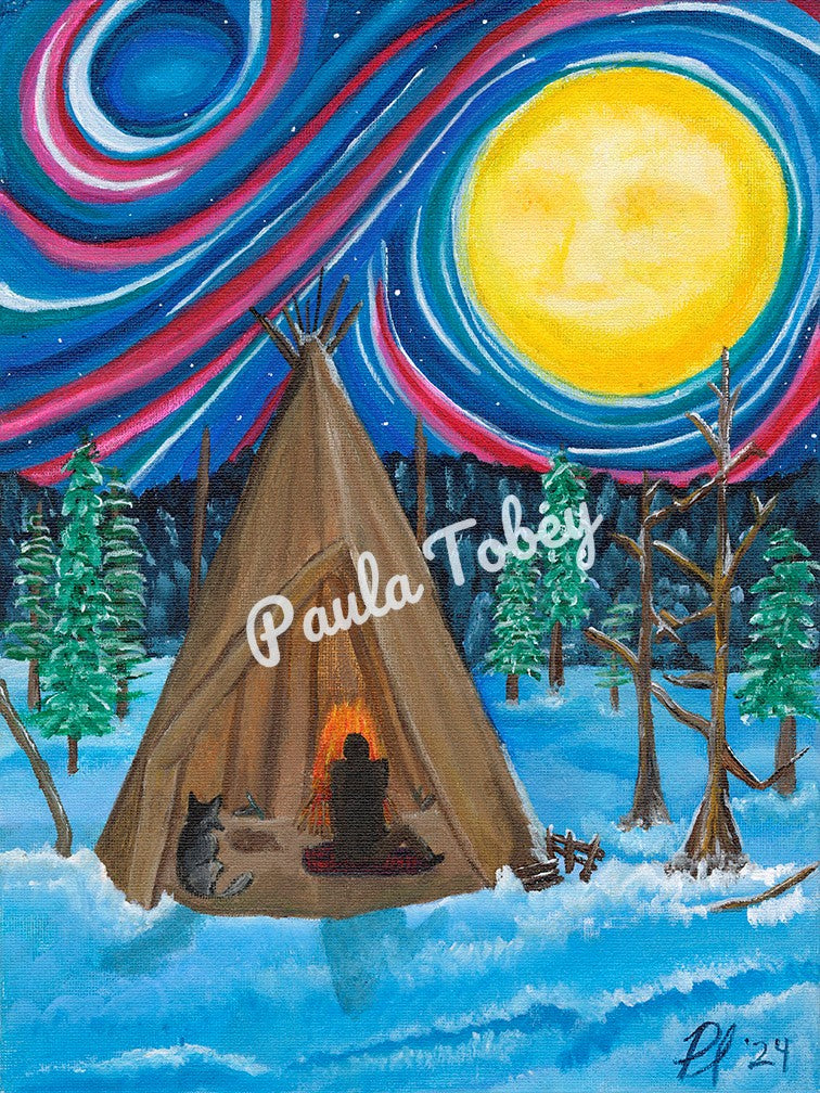 Under the watchful gaze of Giizis, the Big Spirit Moon, a tipi radiates a warm, inviting firelight across the winter landscape. The swirling aurora borealis, waawaate, dances in vibrant blues, pinks, and yellows, connecting the earth and sky. Inside the dwelling, a figure sits in quiet contemplation by the fire, a sacred space for reflection and connection with the spirit world. A faithful companion stands guard at the entrance, a reminder of the animal spirit guides that offer protection and wisdom.