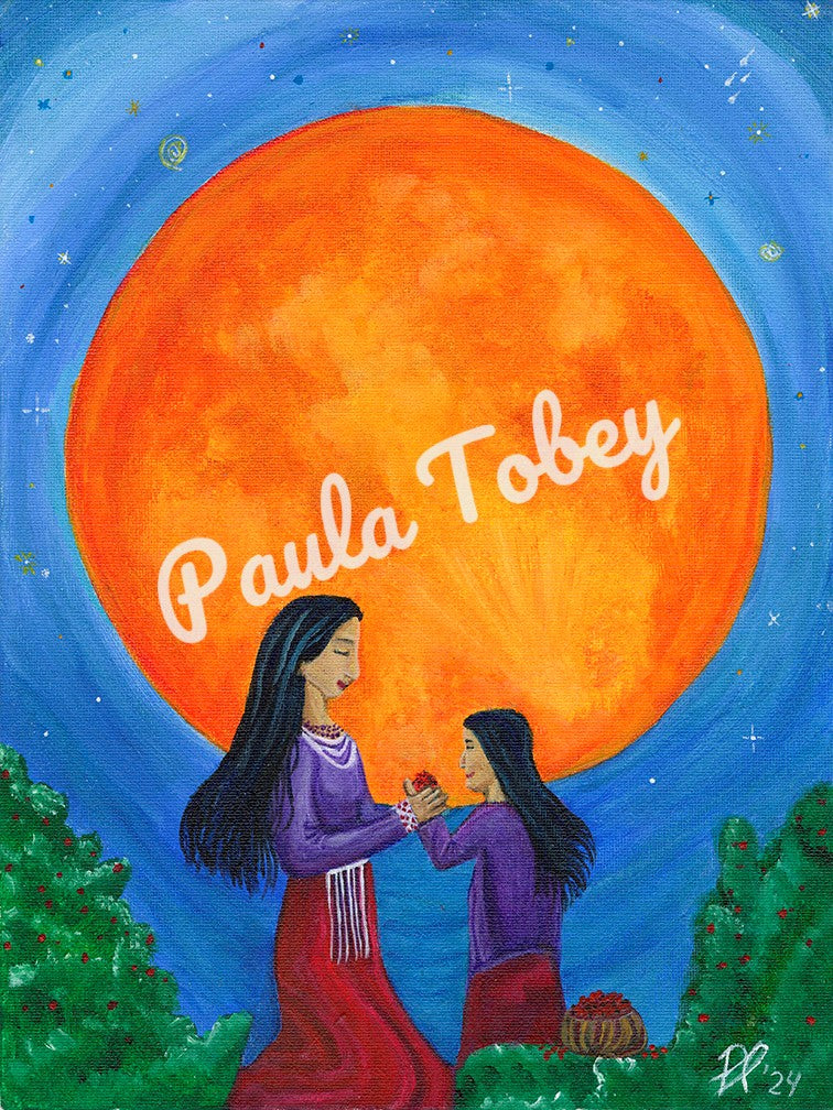 Beneath the radiant glow of Miskomini Giizis, the Raspberry Moon, two sisters gather ripe berries, their matching outfits—purple tops and reddish skirts —a testament to their close bond and shared history. Surrounded by lush raspberry bushes under a starry sky, they embody a sense of joy, tradition, and connection to the land.
