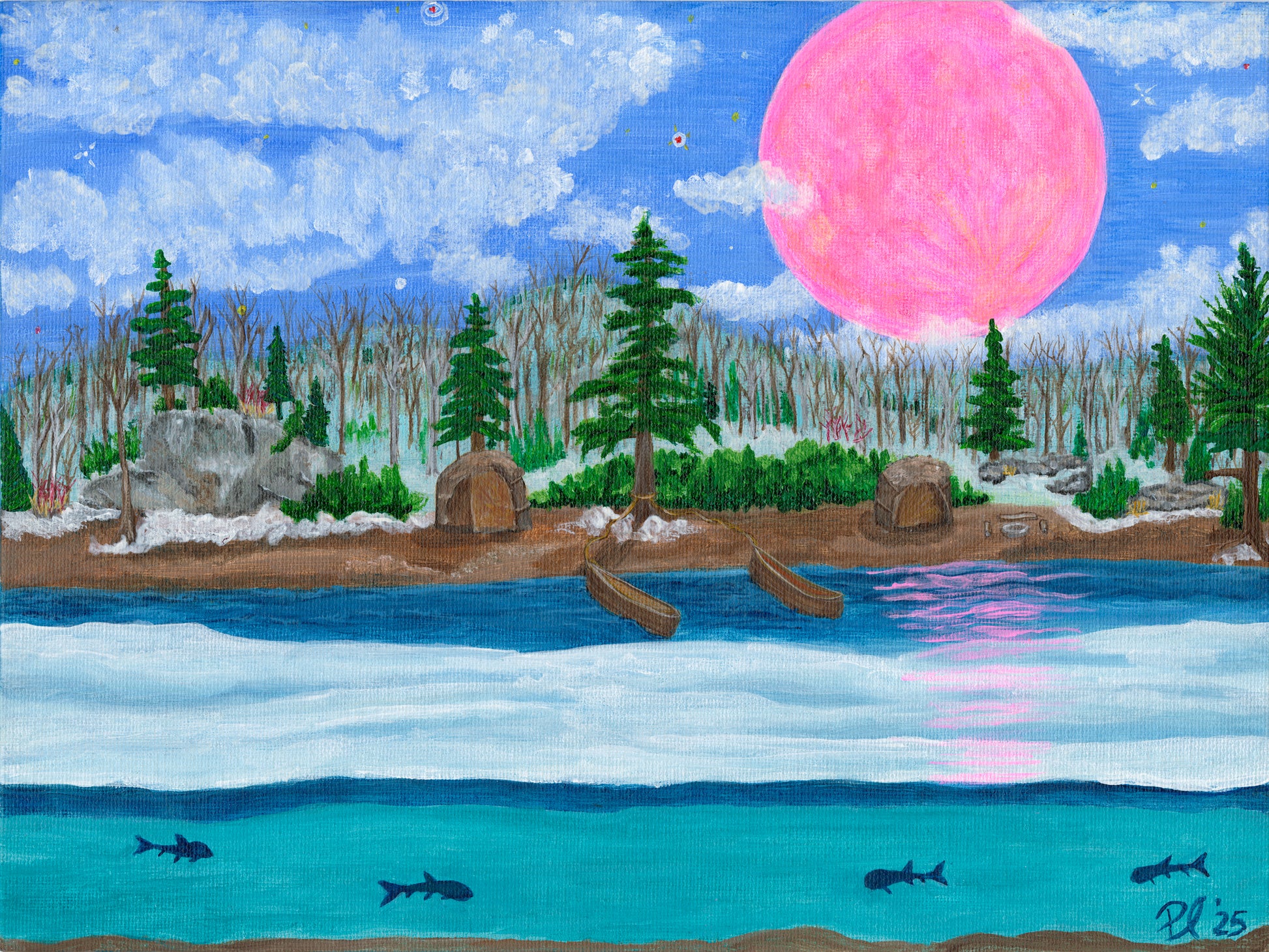 Under the soft glow of Namebine-giizis, the Sucker Moon, an Anishinaabe fishing camp stirs with anticipation as families prepare for the upcoming season. Canoes line the shore of the tranquil lake, ready to navigate the waters in pursuit of namebin, the suckerfish, a vital food source and a symbol of resilience. The pink full moon casts its light upon the dwellings, evoking a sense of peace, harmony, and connection to the natural world.